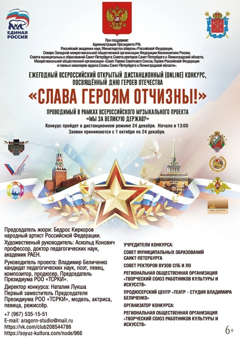 Организация и проведение фестиваля-конкурса осуществляется при поддержке Администрации Президента РФ, Министерства обороны РФ, Генерального Совета Всероссийской Политической Партии «Единая Россия», Администрации Санкт-Петербурга. Учредители фестиваляконкурса: Совет ректоров Санкт-Петербурга и Ленинградской области, Совет муниципальных образований Санкт-Петербурга, Продюсерский центр «Театр-Студия Владимира Беличенко». Организатор фестиваля-конкурса Региональная Общественная Организация «Творческий Союз Работников Культуры и Искусств»