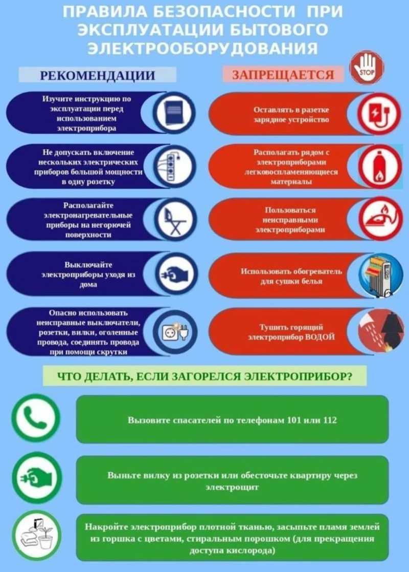 МЧС настоятельно рекомендует соблюдать элементарные правила пожарной безопасности, не эксплуатировать печи при наличии прогаров иповреждений, не использовать нестандартные самодельные электронагревательные приборы и удлинители для их питания, не оставлять без присмотра печи и включенные обогреватели, и тем более не доверять детям следить за ними. Ни в коем случае нельзя размещать обогреватели рядом с горючими материалами, не допускается использовать их для сушки вещей. Кроме того, необходимо помнить, что если от розетки исходит легкий треск, надо отключить от нее электроприбор и вызвать электромастера для устранения неисправности. При срабатывании автоматического выключателя, обесточивающего вашу электросеть, не следует его включать заново, необходимо найти причину. Особое внимание хотелось бы обратить на эксплуатацию газовых баллонов - их нельзя хранить дома и на балконах. Помните, что если полностью заправленный баллон с мороза перенести в тепло, газ расширится и неисправный сосуд может взорваться.