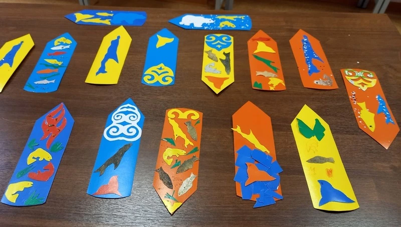 На очередном творческом занятии делали книжные закладки. Изделия получились уникальными, каждый вложил в работу своё видение, своё отношение к культуре нивхов.